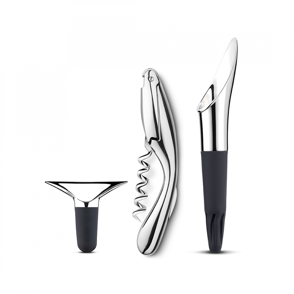 Ett högteknologiskt set som förgyller vinälskarens tillvaro. Från korkskruven som öppnar flaskan med stil och elegans till vinupphällaren som luftar vinet medan det hälls upp (vilket ger vinet en fylligare smak). Svenske arkitekten Thomas Sandell har med denna tidlösa kollektion noga följt alla aspekter inom oenologin. Skapad med samma omtanke som connoissuren ägnar sin vinkollektion – en passande hyllning till vinets underbara värld.