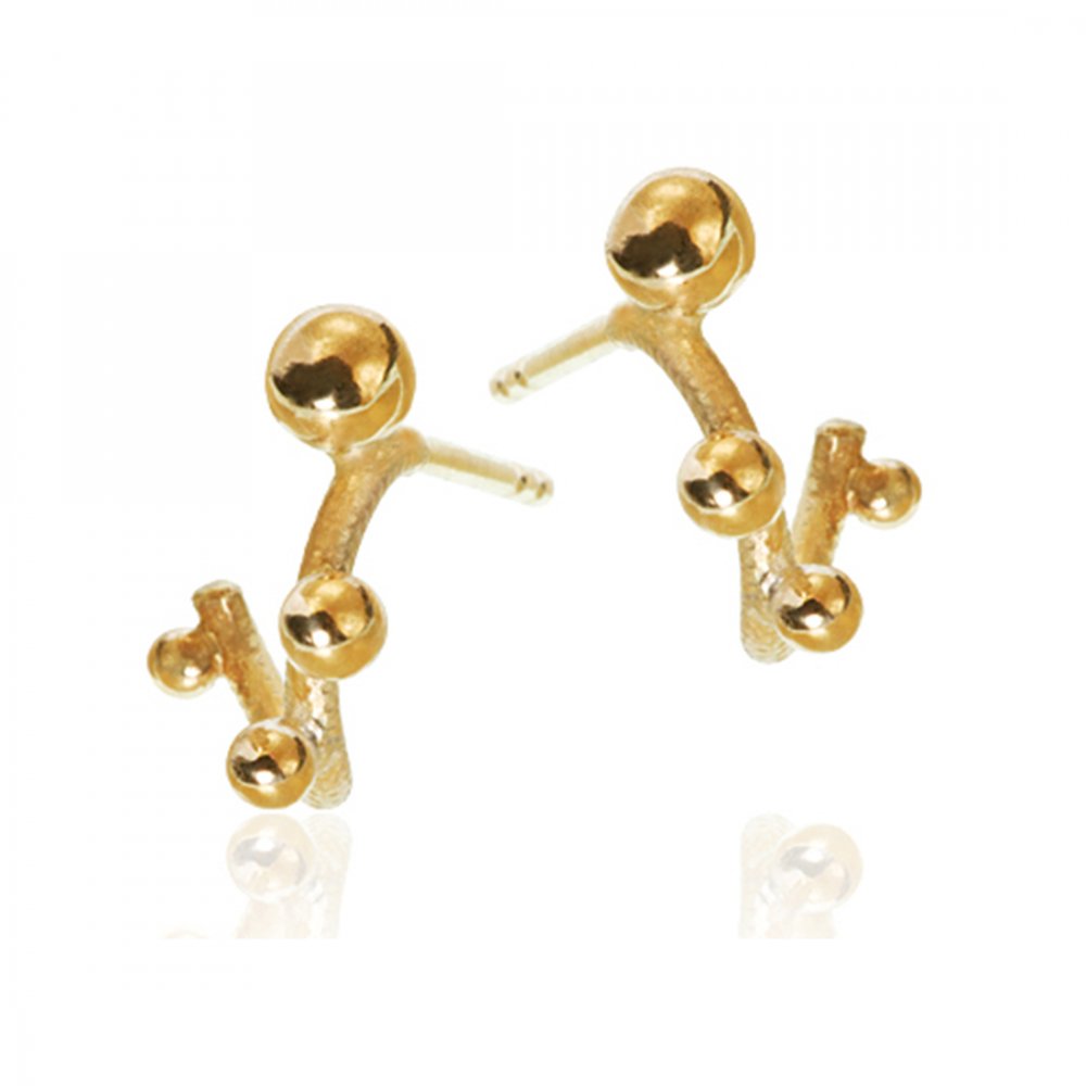 Små och diskreta med vackra detaljer. De blanka kulorna skapar en fin kontrast till det filade matta guldet. Örhängena smyger runt örsnibben perfekt och den stora kulan täcker hålet i örat. Det blir ett par perfekta örhängen att bära till vardags. Observera att det är ett vänster- och högerörhänge.
