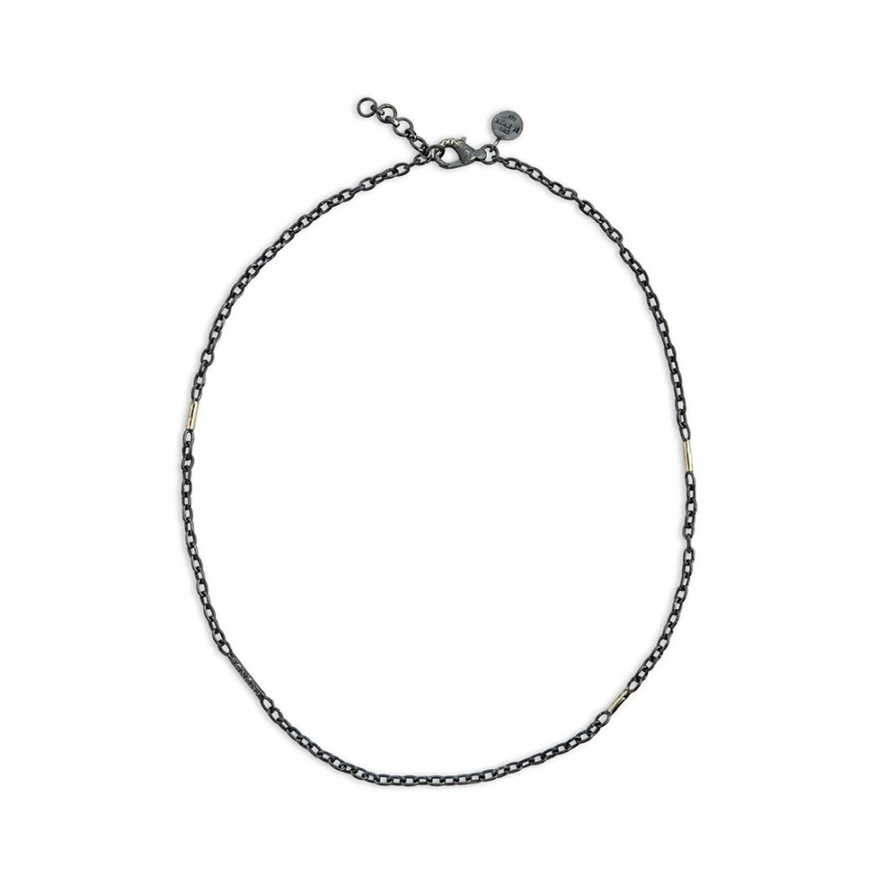 Halskedja "Jacqueline" i oxiderat silver med 18 k hamrat rödguld och en rosenslipade diamanter på 0,10 ct från By Birdie. En kedja som passar att bära för sig, eller tillsammans med ett hänge.