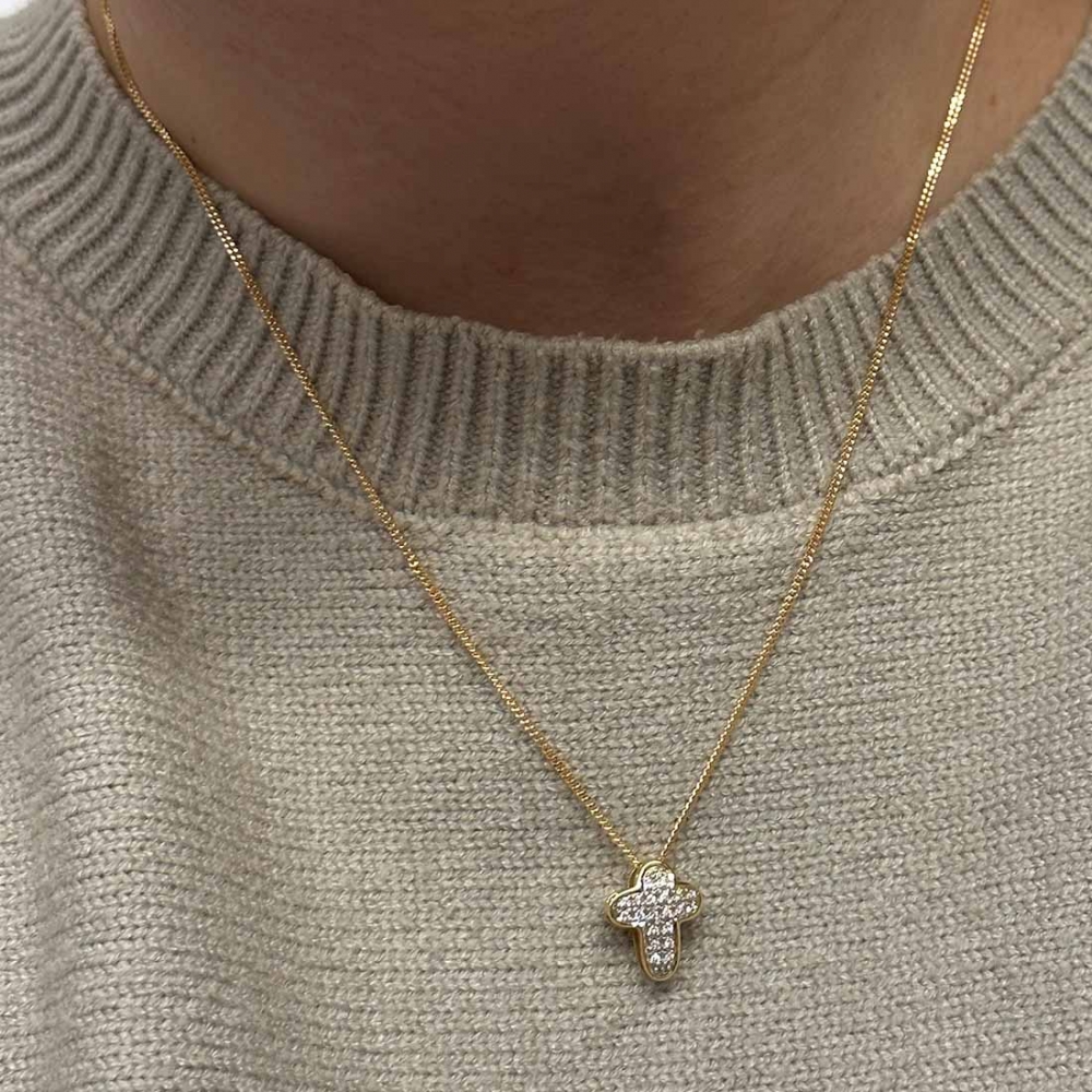 Smycka dig med ett guldkors prydd med briljantslipade diamanter, en gudomlig symbol för tro och tidlös skönhet.