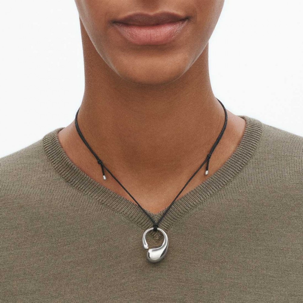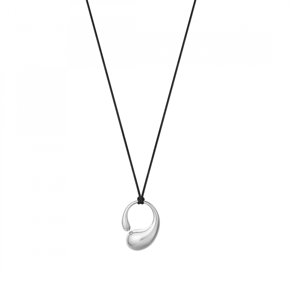 Hänget tolkar de mjuka organiska formerna från Jacqueline Rabuns välkända Mercy-ring. Skulpterat i sterlingsilver och buren i ett vaxbehandlat bomullssnöre med silverändar får smycket ett uttryck som är både avslappnat och sofistikerat.