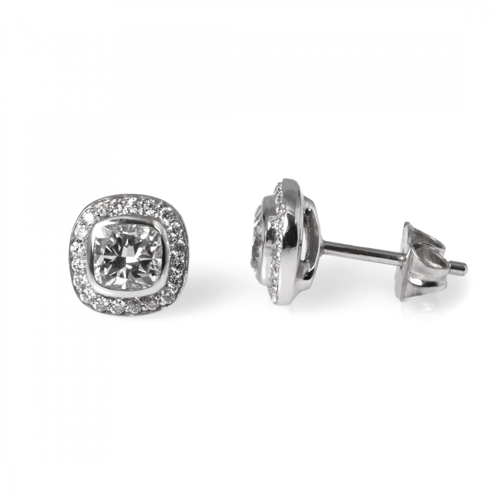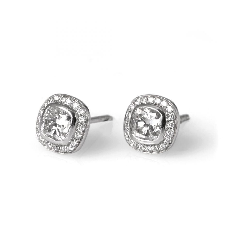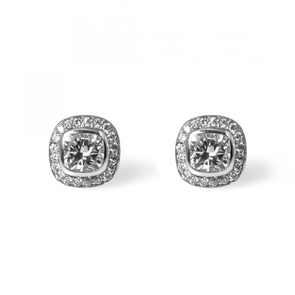 Romantiskta örhängen med smäcker design. Den kuddslipade mittstenen omfamnas av 20 stycken briljantslipade diamanter och framhäver det unika med en fyrkantig diamant. Örhängena kommer att skimra och glittra med varje rörelse.