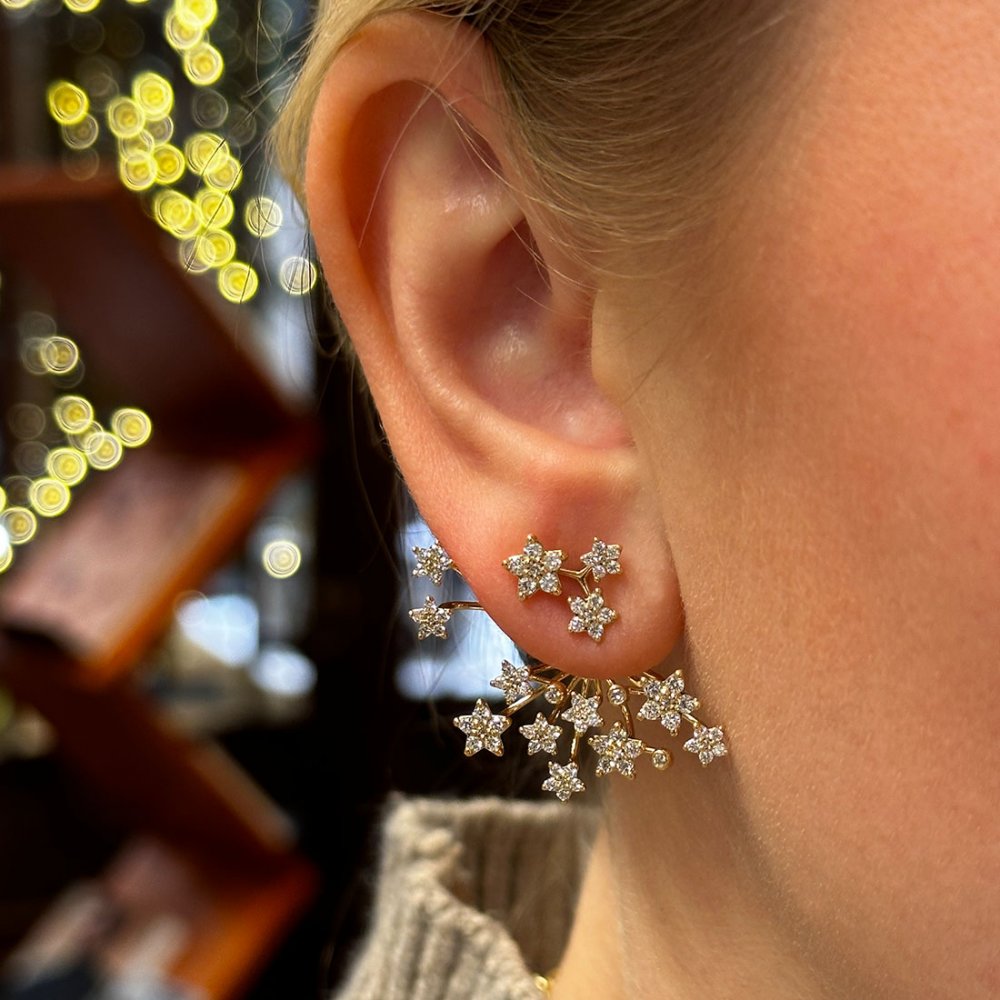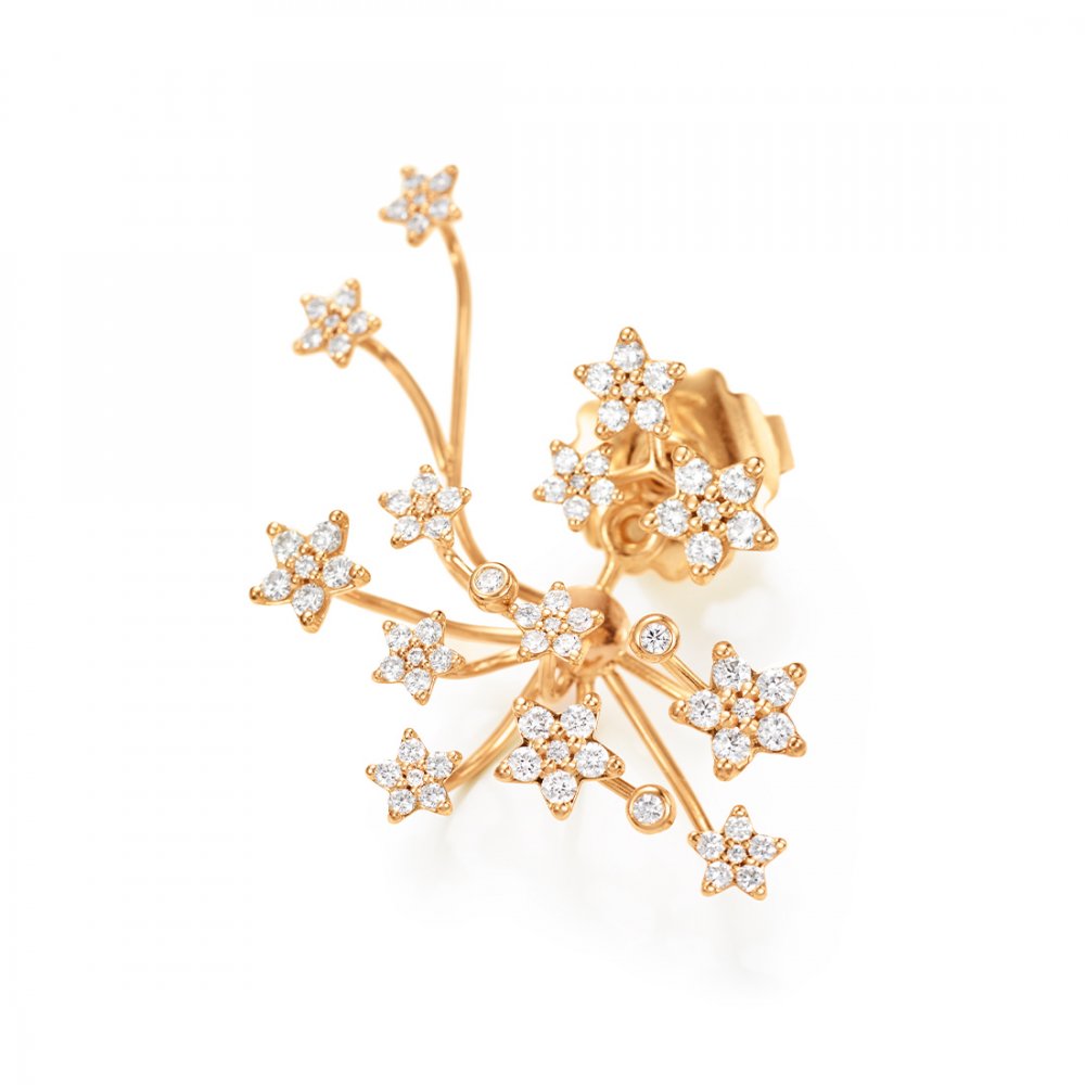 Vackert påhäng till Ole Lynggaard örhängen med gnistrande stjärnor täckta med briljantslipade diamanter i blandade storlekar som adderar lyx till alla tillfällen. Varje stjärna har en något konvex, handpolerad baksida. Varje stjärna består av 6 briljantslipade diamanter, höjda från ytan för att tillåta maximalt ljus reflektera, vilket ger upphov till stjärnans skarpa och gnistrande egenskaper.