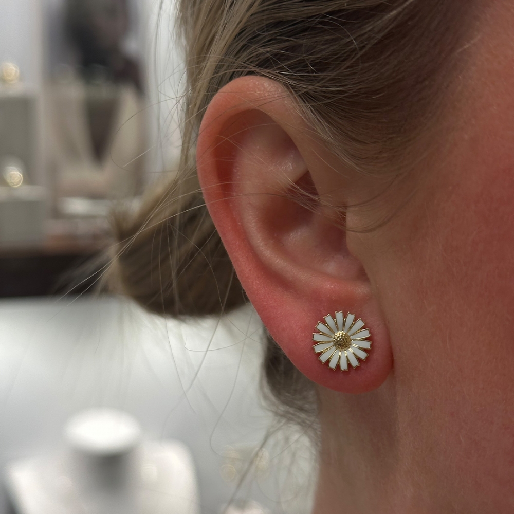 Daisy örhängen i förgyllt silver med blommor i vit emalj från Georg Jensen.