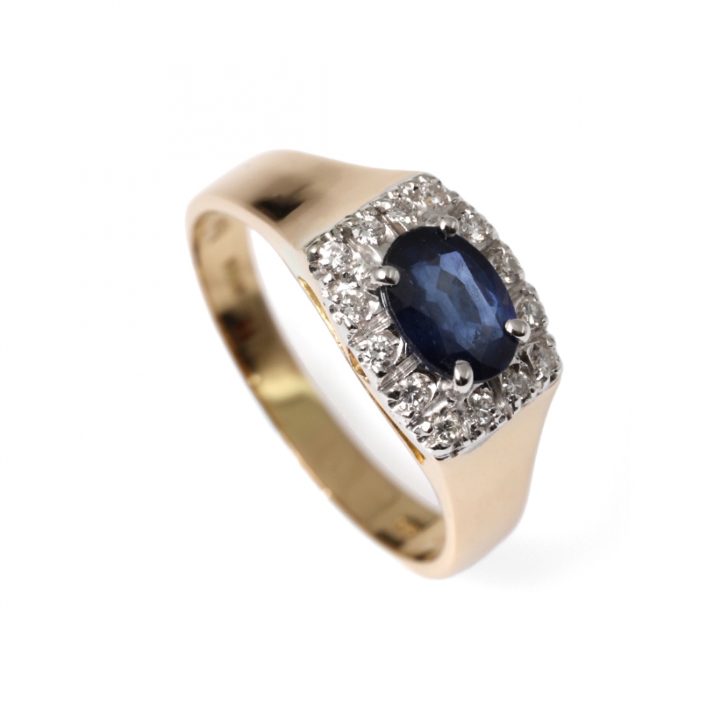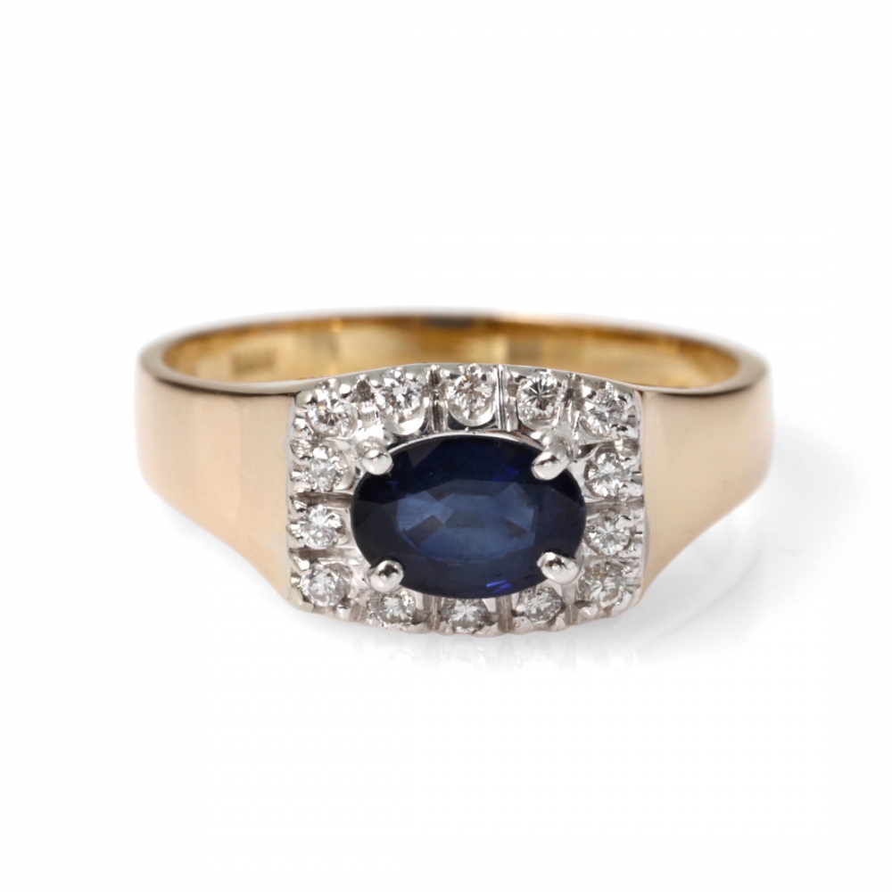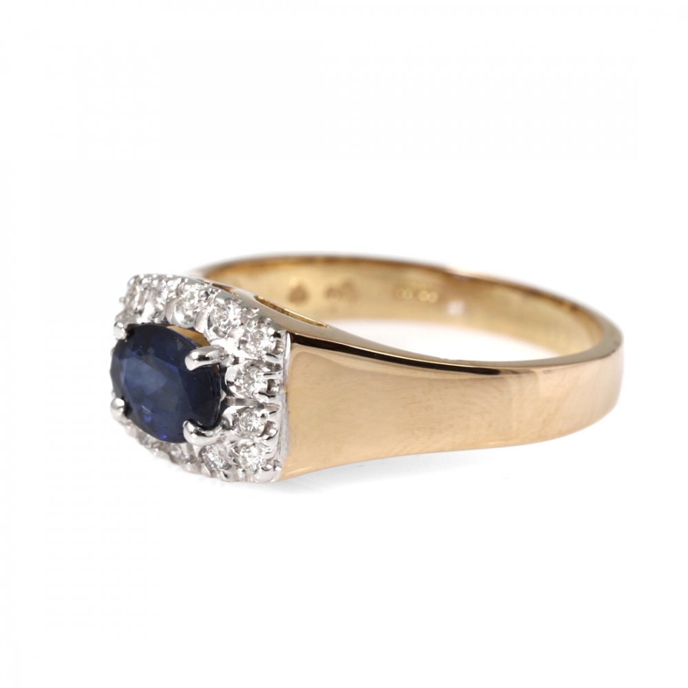 Ring i 18k guld med en oval safir i en fyrkantig fattning med briljantslipade diamanter från Carl Hoff Selection.