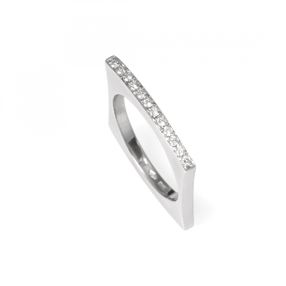 En modern och stilren ring i 18 karat vitguld, designad med en unik fyrkantig form och en elegant blank yta. Längst fram på ringen sitter 12 briljantslipade diamanter infattade.