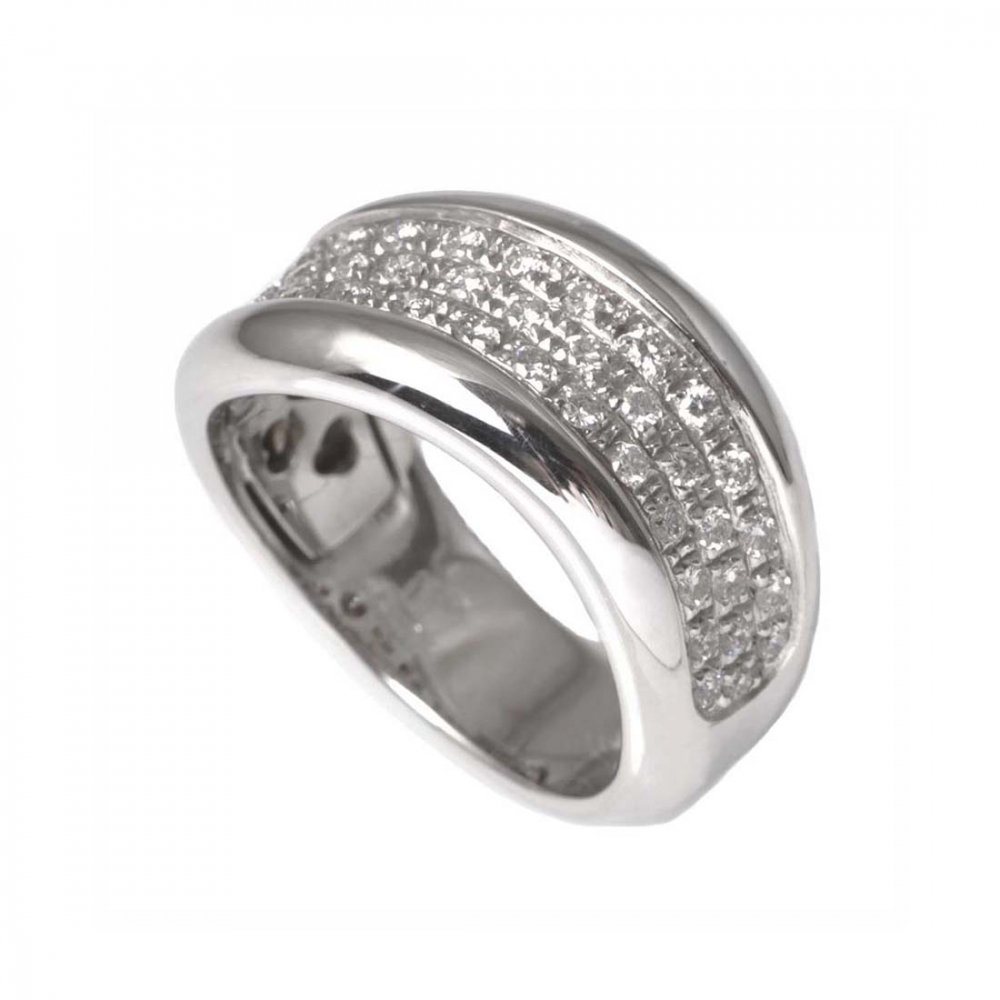 Ringen är svängd och tillverkad i 18k vitguld. Längst fram är tre rader briljantslipade diamanter pavéfattade.