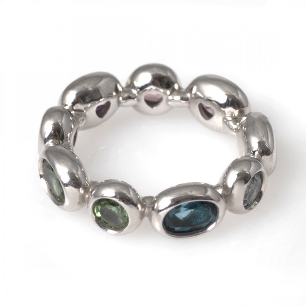 Precis som små bubblor sträcker sig ringen över fingret och skapar en intressant design med ametist, turmalin och topas. Ringen tillhör kollektionen Bobbel, en äldre kollektion som inte längre tillverkas och vi har ett exemplar kvar, så passa på så kan detta danska designsmycke bli ditt.