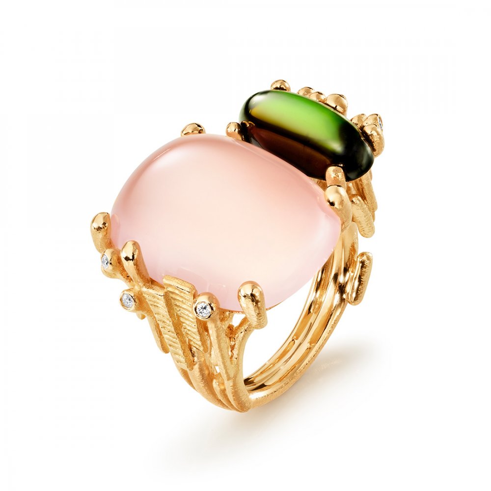 BoHo ring från OLE LYNGGAARD COPENHAGEN i guld med rosenkvarts och grön turmalin samt 6 briljantslipade diamanter.