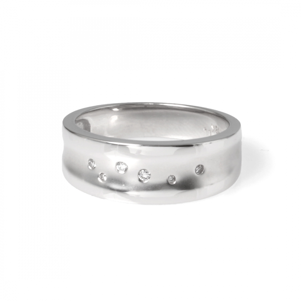Denna eleganta ring i 18k vitguld har en unik design där mittenpartiet är lätt nedsjunken för att skapa en subtil men effektfull form. De briljantslipade diamanterna är utspridda, vilket ger en naturlig och gnistrande asymmetri.