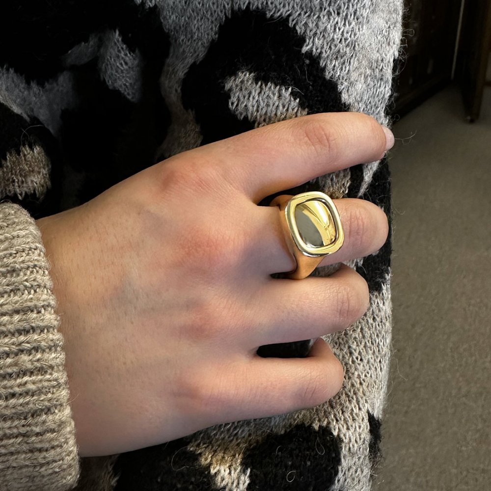 Inspirerad av den karaktäristiska klackringen är denna kollektion designad av Charlotte Lynggaard. Ringen är tillverkad i 18 karat gult guld handpolerar av mästerguldsmeder. Den centrerade guldplåten är lämplig för gravering. Cushion ringen är utsmyckad med ett dolt stjärnmönster innuti ringskenan vilket gör att Cushion ringen inte bara ett vackert smycke, utan påminner dig om lysande stjärnor.