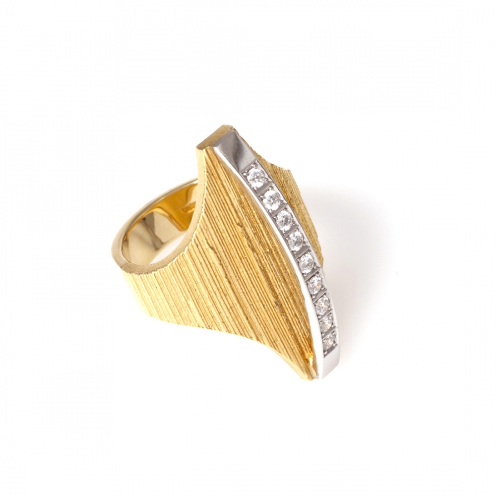 Ringen är handgjord i Helsingfors med texturerat gult guld, platina och diamanter. Ett klassiskt Lapponia smycke designad av Björn Weckström. Finländske Björn Weckström är en erkänd smyckesdesigner och skulptör. De guldkorn som han hittade i finländska Lappland i början av 1960-talet gav upphov till en helt ny smyckedesign där former och annorlunda ytbehandling låter guldets ursprungliga glans komma till sin rätt. Björn ser smycken som miniatyrskulpturer som bottnar i människans personlighet. Hans Lapponia smycken har hittat sin egna lojala och trogna användarskara. Vissa ser hans Lapponia smycken som konstverk, som ett spännande identitetslyft eller helt enkelt som vackra. Personer som Georg Lucas har valt smycken i från Björn Weckström i filmer som Star Wars.