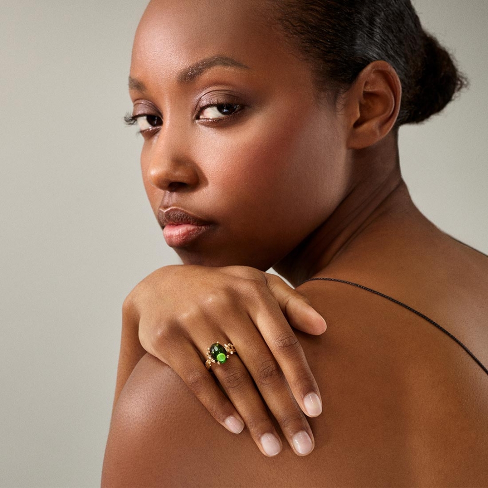 Boho Ring från OLE LYNGGAARD COPENHAGEN i 18k guld med grön turmalin och 3 briljantslipade diamanter.